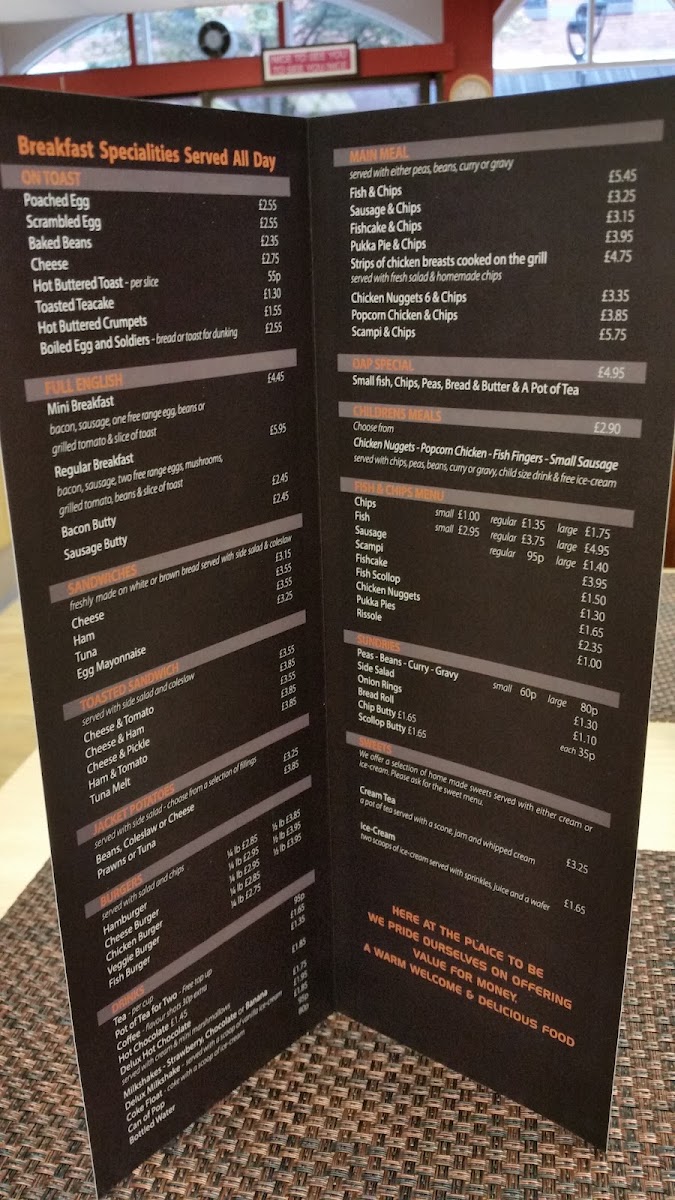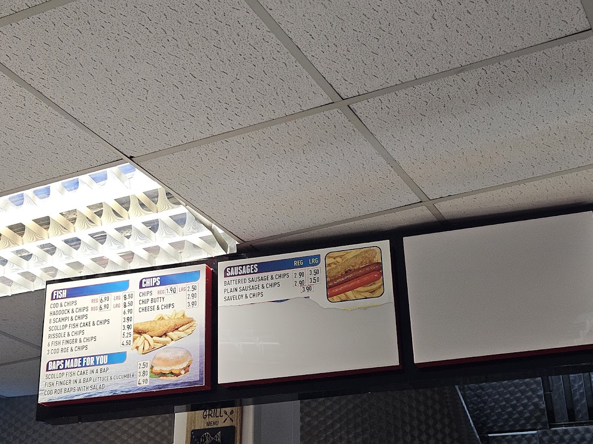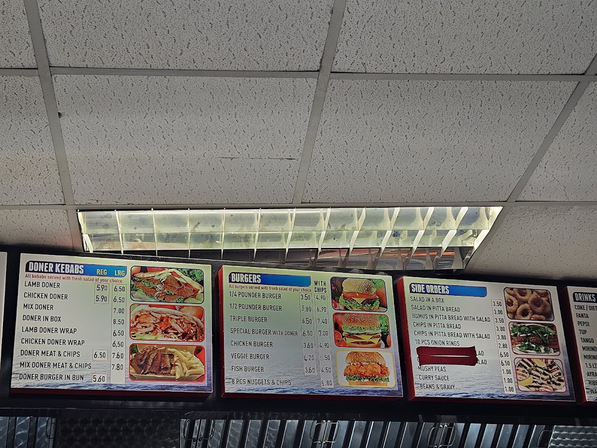 The menu at The Plaice To Be in Rotherham offers a variety of satisfying options for every taste. For those craving a hearty meal, the Lamb Doner (£4.50), Chicken Doner (£4.50), and Mix Doner (£4.90) are available in wraps or served in a box, while the Doner In Box (£5.50) provides a larger portion. The burger selection includes the classic 1/4 Pounder Burger (£3.80) and 1/2 Pounder Burger (£4.80), along with a Triple Burger (£5.80) and a Special Burger With Doner (£6.50). For sides, try the Chips In Pitta Bread With Salad (£3.50) or the Salad In A Box (£2.00). The Full English options like the Mini Breakfast (£4.00) or Regular Breakfast (£5.00) are perfect for starting the day, while the Bacon Butty (£2.50) or Sausage Butty (£2.50) makes a quick, satisfying snack. Sandwich lovers can enjoy choices like the Ham Sandwich (£3.00) or the Tuna Sandwich (£3.50). The Fish & Chips menu is extensive with choices like Cod & Chips (£5.50), Haddock & Chips (£5.90), and Pukka Pie & Chips (£4.50). Additionally, they serve Scampi & Chips (£5.00) and Fishcake & Chips (£4.50), making it a go-to spot for traditional fish and chips lovers. Don’t miss the Jacket Potato with Prawns (£4.50), or enjoy a Scollop Fish Cake In A Bap (£3.00). For a sweet treat, the Ice-Cream (£1.50) or Cream Tea (£2.50) are great ways to finish off your meal. Drinks like Coke (£1.00), Pepsi (£1.00), and Fanta (£1.00) are also available to quench your thirst.